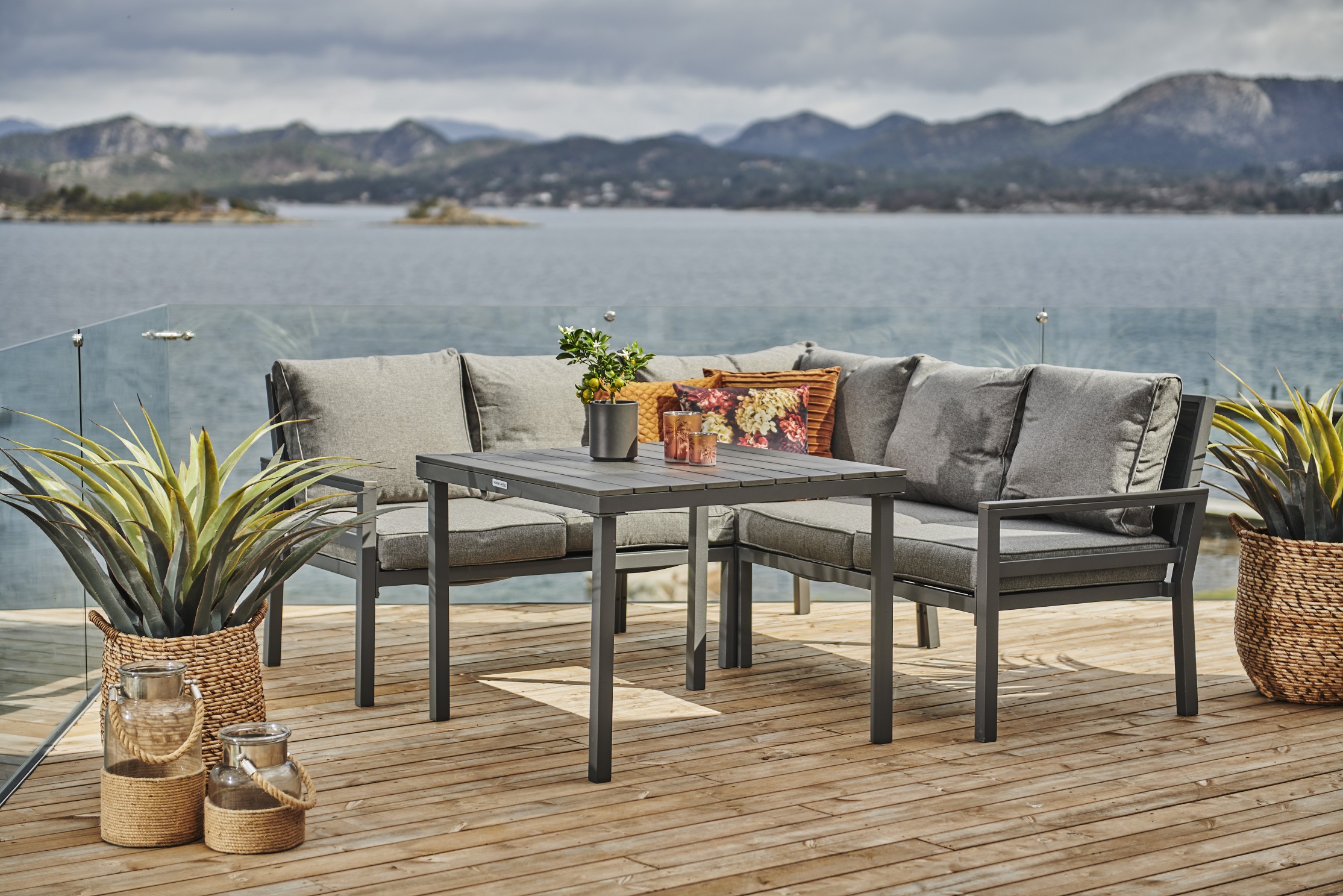 En koselig liten sofagruppe med stilrent design. Gruppen kommer fra det norske kvalitetsmerket Easy living av Martinsen. Laget av aluminium og aintwood. Den komfortable 5-seters sofaen gir plass til hele familien for å nyte sommeren. Pent spisebord med topplate av aintwood som gjør det enkelt å holde rent. Værbestandige grå puter.