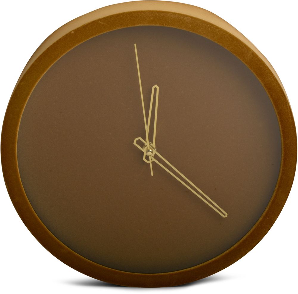 En pen og klassisk veggklokke i sennepsgul plast med gullfargede visere.