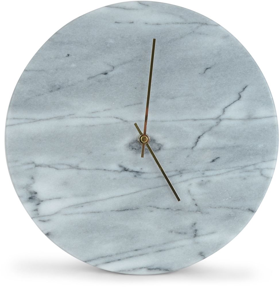 En pen og moderne veggklokke i grå marmor med sølvfargede visere.