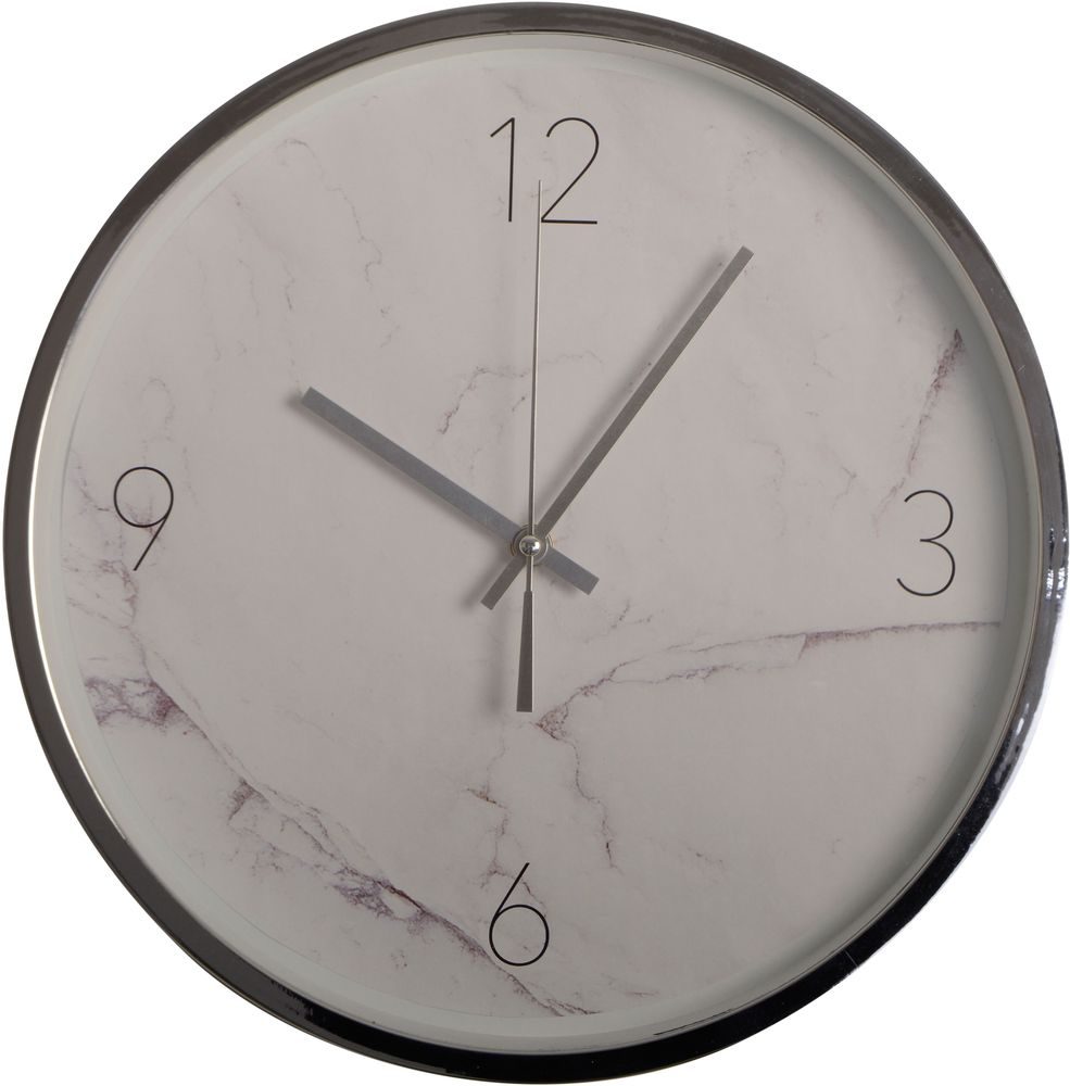 En pen og klassisk veggklokke i plast med hvit marmor imitasjon og sølvfargede visere.