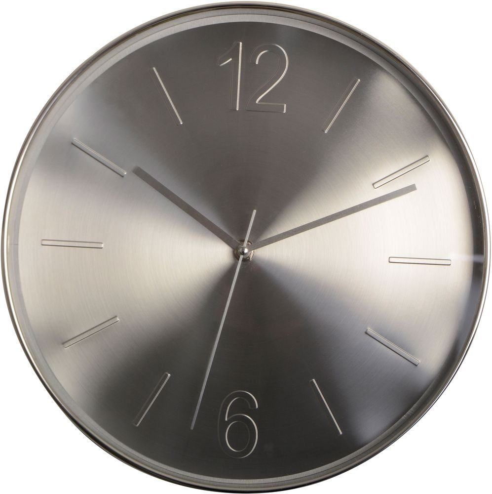 En pen og moderne veggklokke i sølvfarget plast.