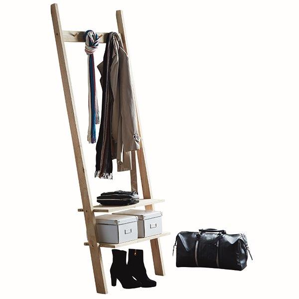 Stilig trappehylle i massivt hevea tre med både hylleplan og kroker for klær og lignende.