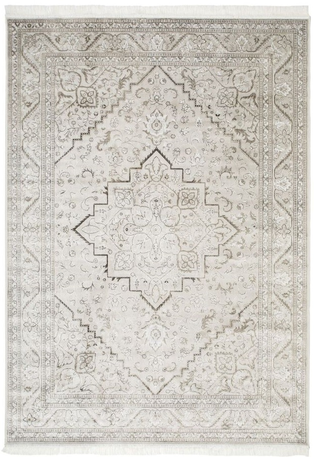Casablanca Kashan har en sølvfarget bunnfarge med matchende kantsøm og hvite frynser på kortsidene. Teppet har et klassisk orientalsk mønstersom går i beige, grå og hvite toner.