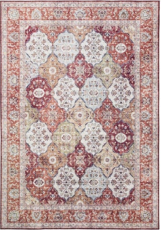Cleo Colourful er et elegant teppe som har et vakkert mønster med orientalsk inspirasjon. Teppet har en melert rustrød bunnfarge med et trykt mønster i röda och blå toner. Kantene på teppet er pyntet med en sydd kantsøm bestående av ordentlige sting i rød tone, som gir en eksklusiv og luksuriøs følelse.