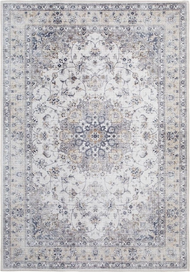 Cleo Tabriz er et elegant teppe som har et stilrent mønster med orientalsk inspirasjon. Teppet har en melert lysegrå bunnfarge med et trykt mønster i grå, blå og gullfargede toner. Kantene på teppet er pyntet med en sydd kantsøm bestående av ordentlige sting, som gir en eksklusiv og luksuriøs følelse.