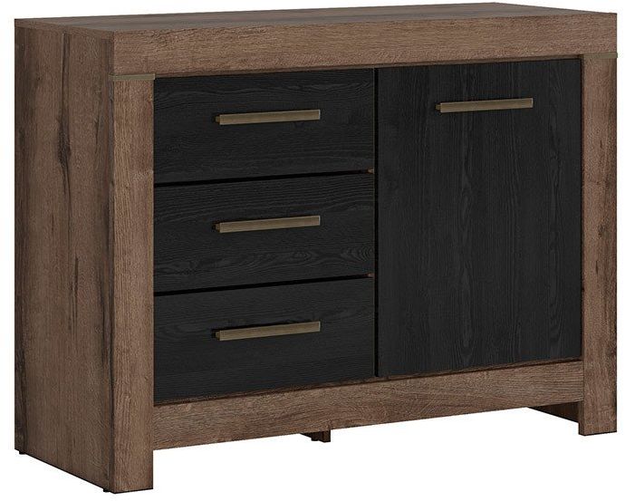 Moderne kommode laget av sponplater med eik / mørk eikimitasjon. Ett skap og tre skuffer for enkel lagring.