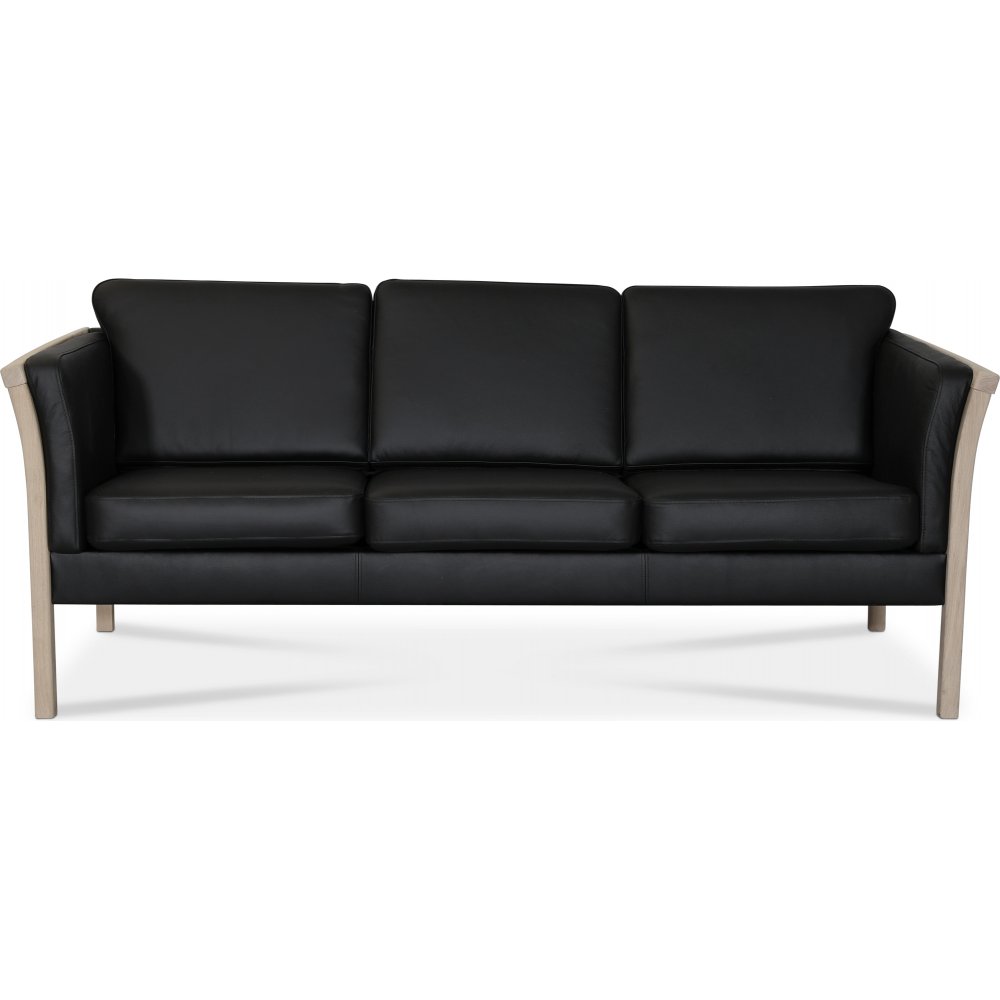 Pure 3-seters sofa i moderne og skandinavisk design. Sofaen leveres i mykt og slitesterkt svartfarget lær med en hvitoljebehandlet eikeramme. Polstring i sete- og ryggputene er 45 kg kaldskum av høy kvalitet med topp av polyetylenvatt. Læret er nøye utvalgt fra Italia og har høy kvalitet. På baksiden og sidene er sofaen trukket i svart spaltlær.