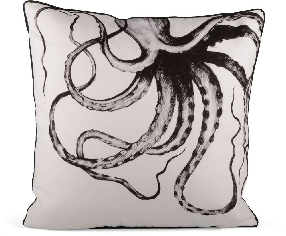 En stilren og koselig pute i hvit tekstil med motiv av en blekksprut. Foret med bomull.