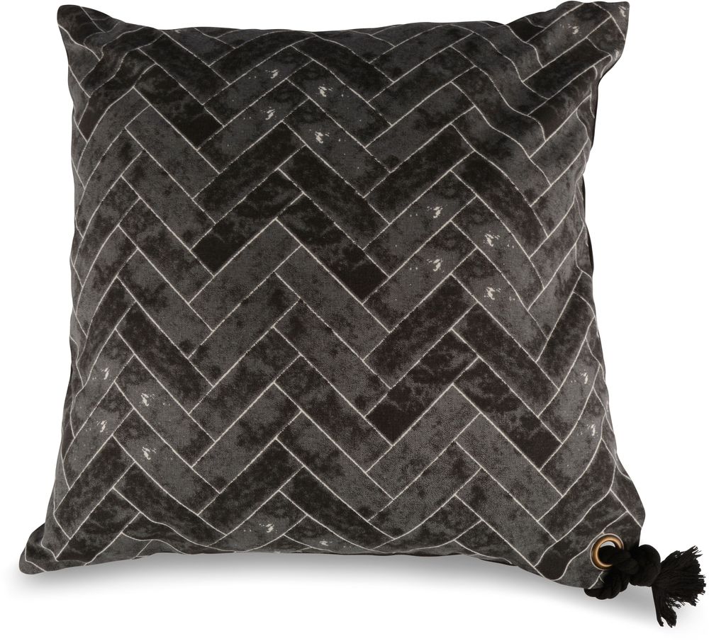 En myk og fin pute i svart mønstret tekstil og stoppet med bomull. En fin dekorativ knute i ene hjørnet.