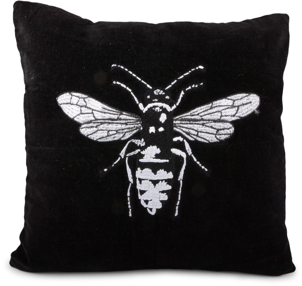 En pen og koselig pute i svart tekstil med motiv av en insekt, foret med bomull.