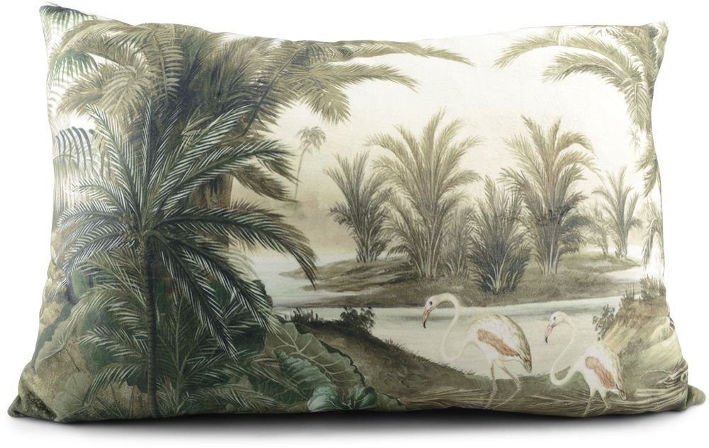 En pen og koselig pute i tekstil med fint motiv av svaner på en tropisk plass. Foret med bomull.