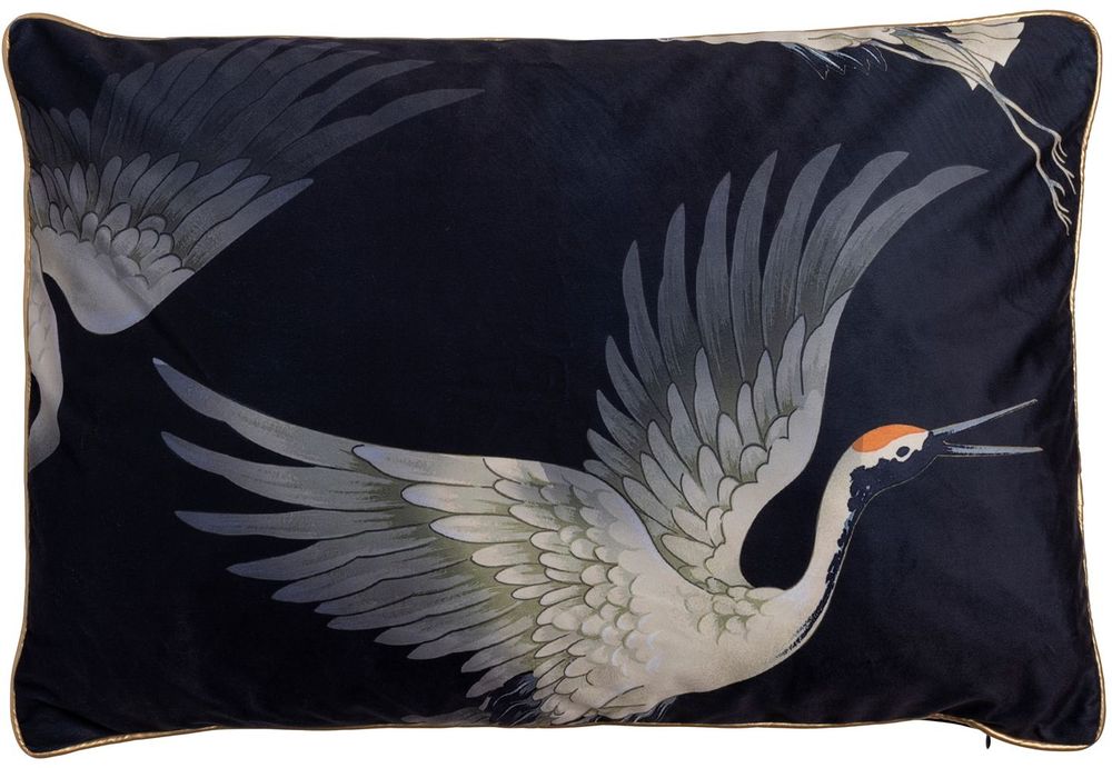 Putetrekk i fløyel med fint fuglemønster på fremsiden og ensfarget bakside. Gullfarget piping i PU rundt om og skjult glidelås i bunnen.
