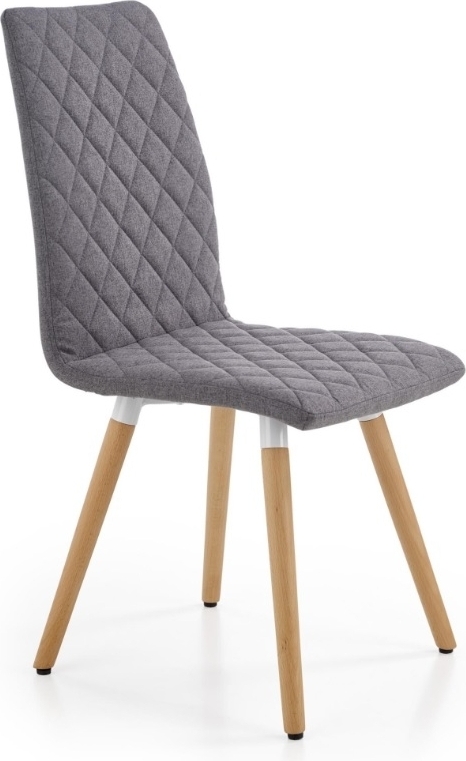 En vakker spisestol med et stilrent design. Spisestolen er laget av heltre med det naturlige treutseendet på beinene og setet er kledd med et svært behagelig stoff som gir maksimal komfort.