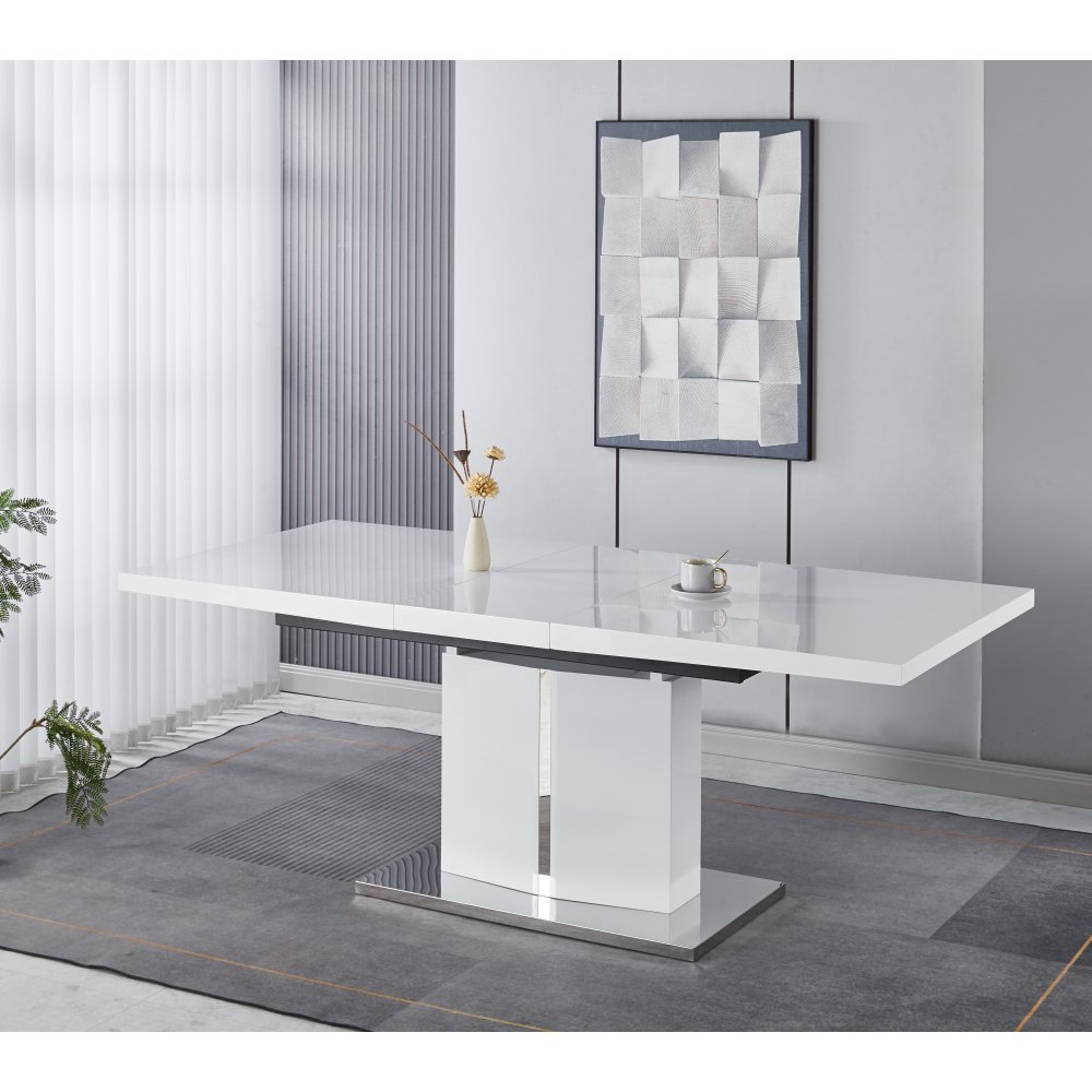 Ratliff spisebord i hvit høyglanslakkert MDF med metalldetaljer. Spisebordet kan enkelt forlenges fra sin opprinnelige lengde på 160 cm til 200 cm med den medfølgende forlengelsesplaten. Bordet passer for 4-10 personer.