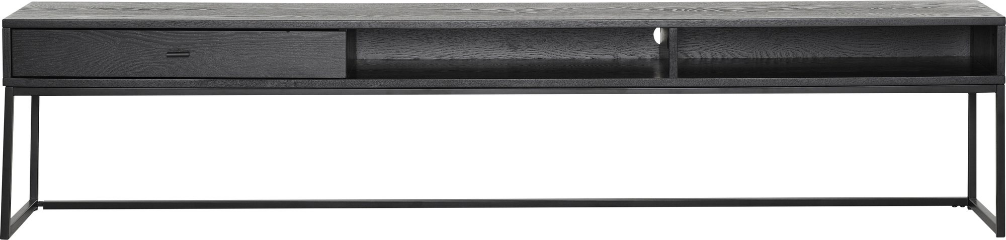 Mediabenk i sortlakkert ask finér med metallben. Leveres umontert.