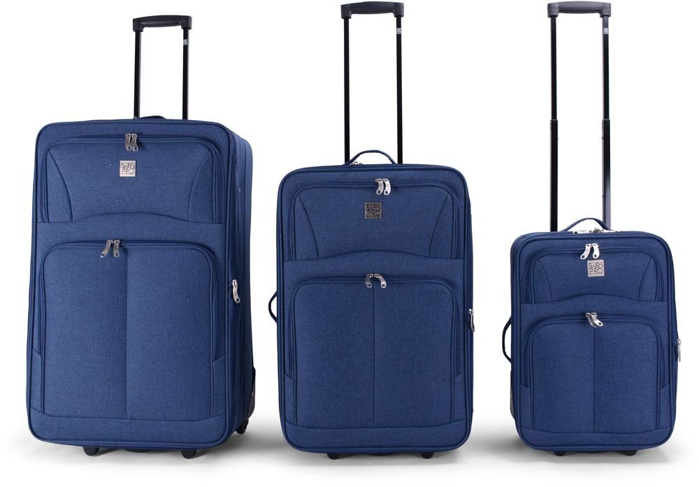 Sett med reisevesker i tre ulike størrelser. Tilvirket av tekstil og polyester med hjul og håndtak. Veldig romslige med et flertall lommer på både innsiden og utsiden.