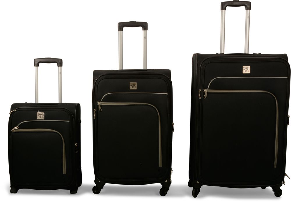 Sett med reisevesker i tre ulike størrelser. Tilvirket av tekstil og polyester med hjul og håndtak. Veldig romslige med et flertall lommer på både innsiden og utsiden.