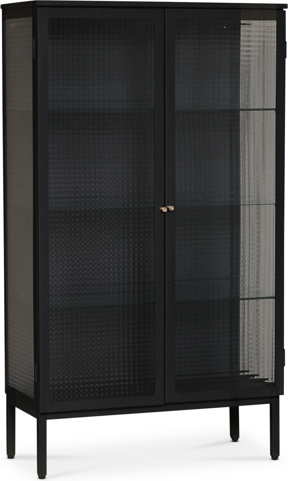 Skandinavisk design med rene linjer. Revel highboard i sort sandlakkert metallplate med rutete krystallglass og håndtak i matt messing. 2 dører med gittermønstret krystallglass og også gittermønstret krystallglass på sidene som slipper lyset inn i skapet. Glasshyller for å gi en "svevende" følelse.