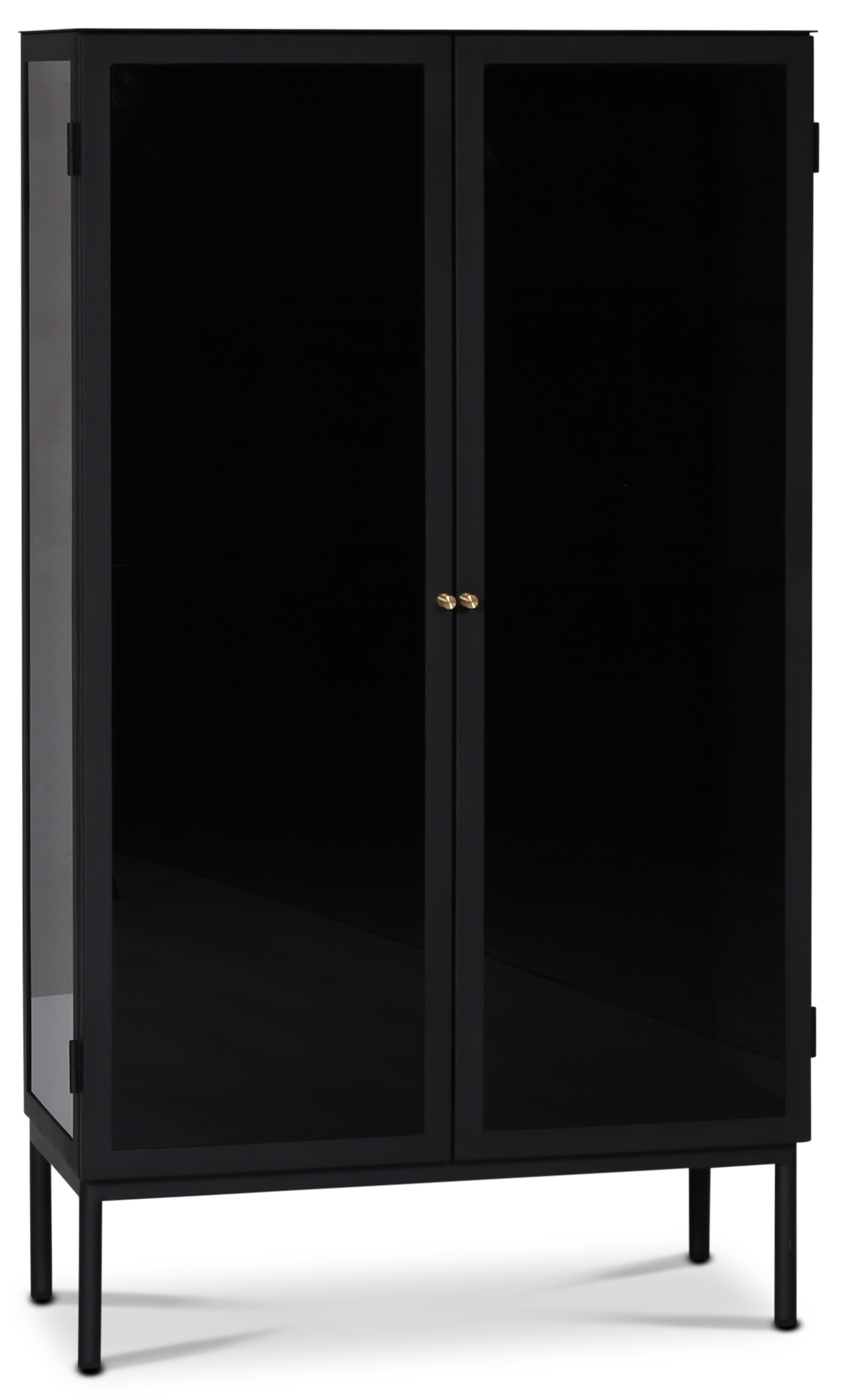Skandinavisk design med stilrene linjer. Fryd høybord i svart sandlakkert plate med mørktonet glass og håndtak i matt messing. 2 dører med mørktonet glass og i tillegg mørkt tonet glass på sidene som slipper lyset inn i skapet. Hylle i glass for å gi en "flytende" følelse.