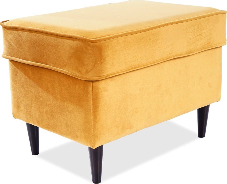 Fotskammel laget av tre. Trukket med polyesterstoff.