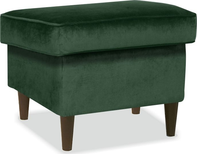 Fotskammel laget av tre. Trukket med polyesterstoff.