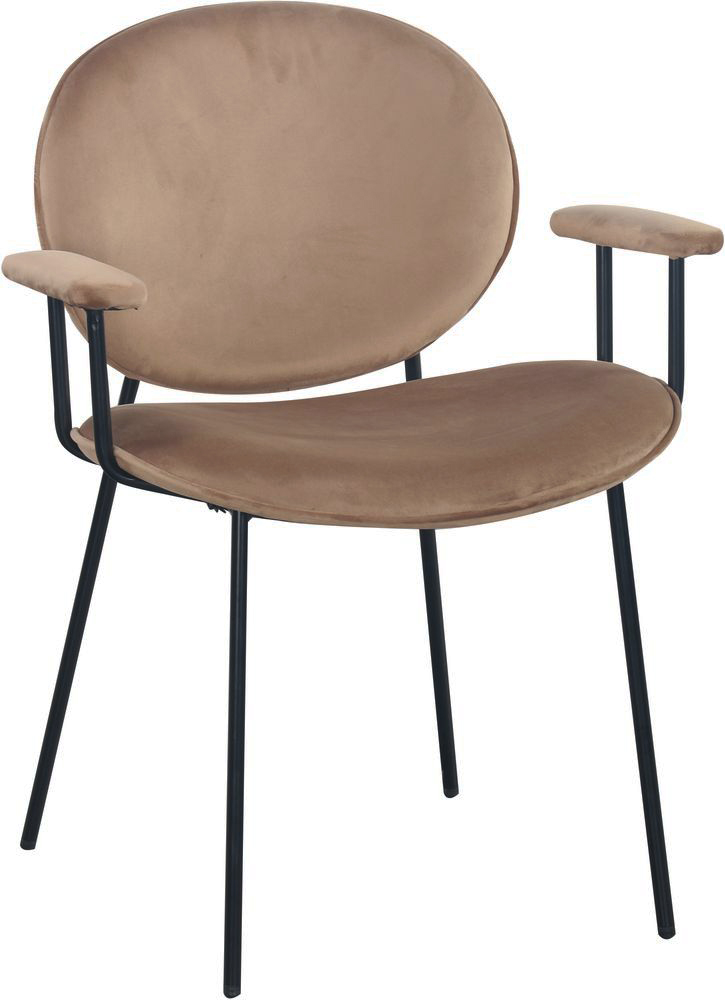 Moderne karmstol med sete og rygg kledd i et pent beige fløyelstoff. Ben av svartmalt metall.