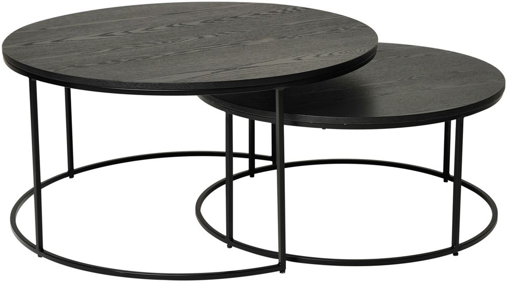 Sett med 2 prydlige og stilrene salongbord med topplater av svart askfinér og stamme av svart metall.