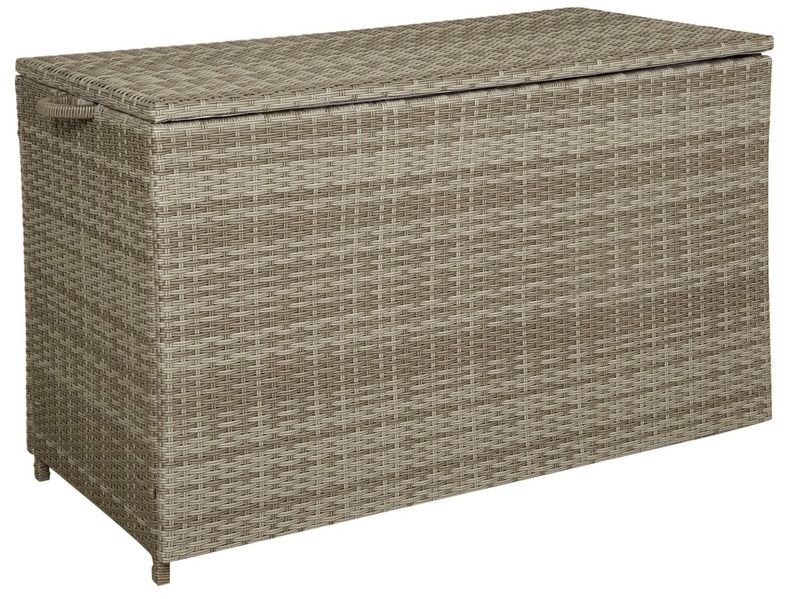 Puteboks i lys grå kunstrotting til uteplassen. Denne boksen kan være et godt supplement til våre Rosario sofagrupper. Her kan for eksempel puter oppbevares på en hendig og ryddig måte.