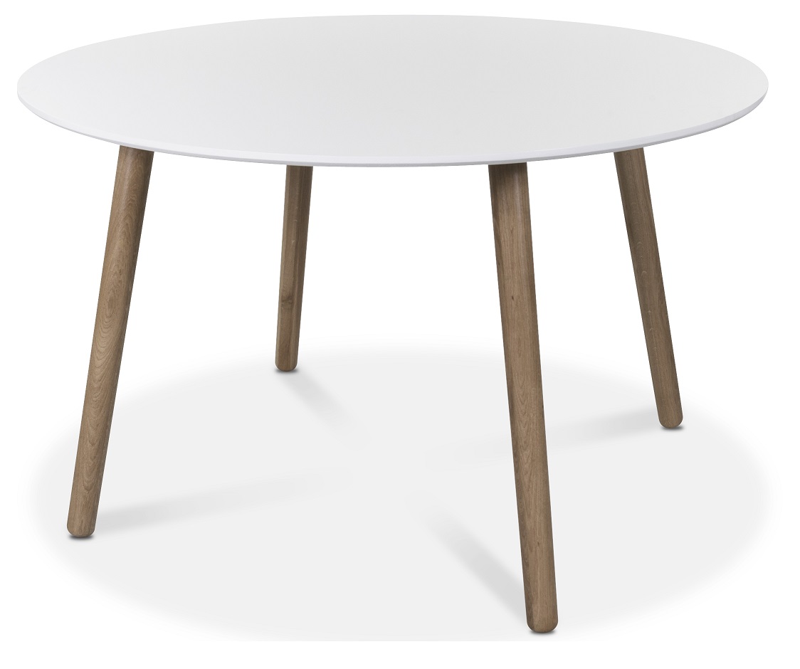 Et rundt spisebord 120 cm i diameter med bordplate i hvitlakkert tre og tidsriktige runde og massive eikeben. Dette bordet passer inn i de fleste miljøer med sitt stilrene uttrykk!