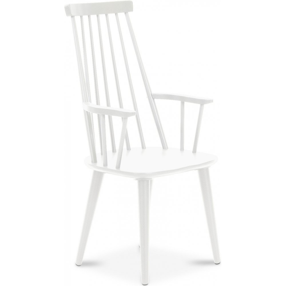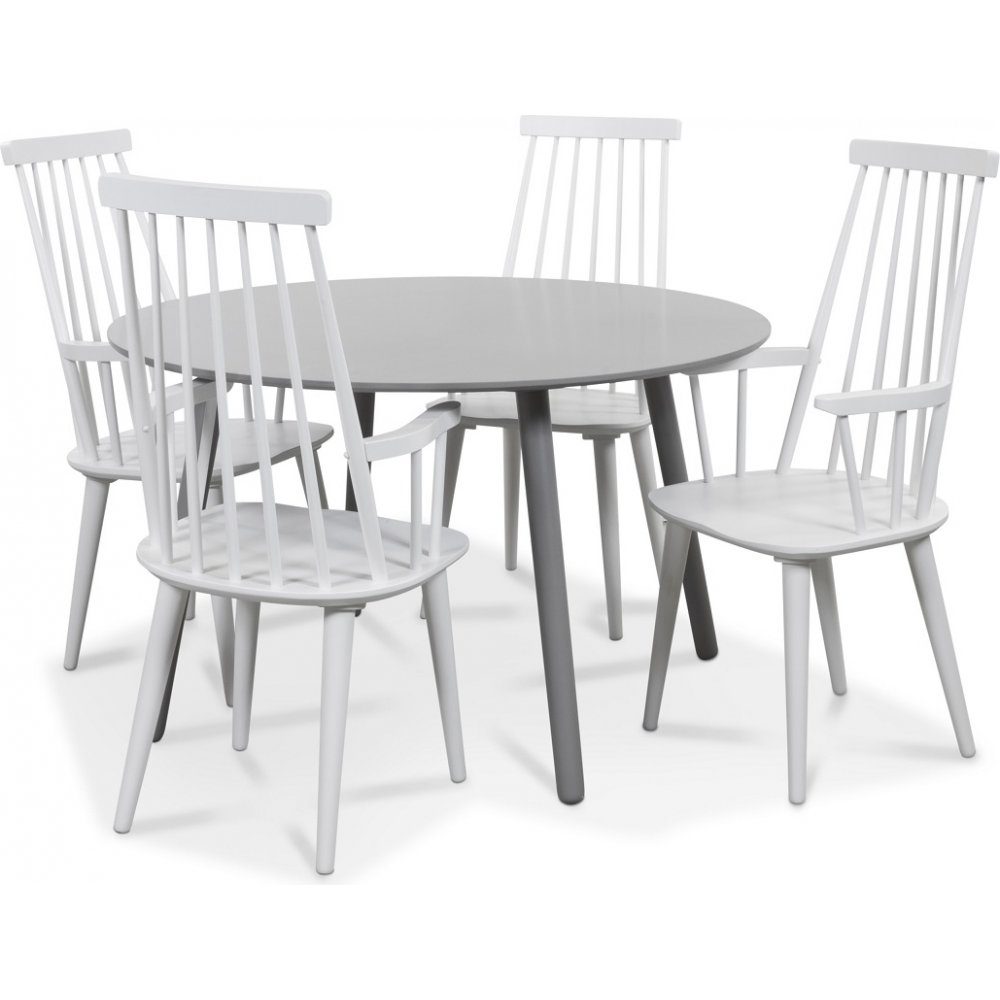 Rosvik spisegruppe grått rundt bord med 4 hvite Dalsland stokkstoler