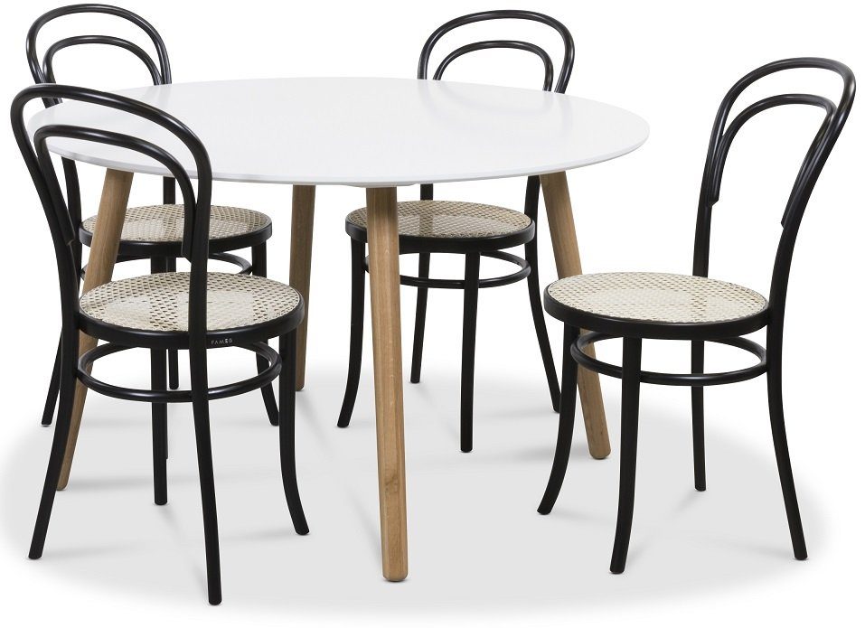Rosvik spisegruppe Rundt bord hvit/eik med 4 st svarte Thonet no14 stoler