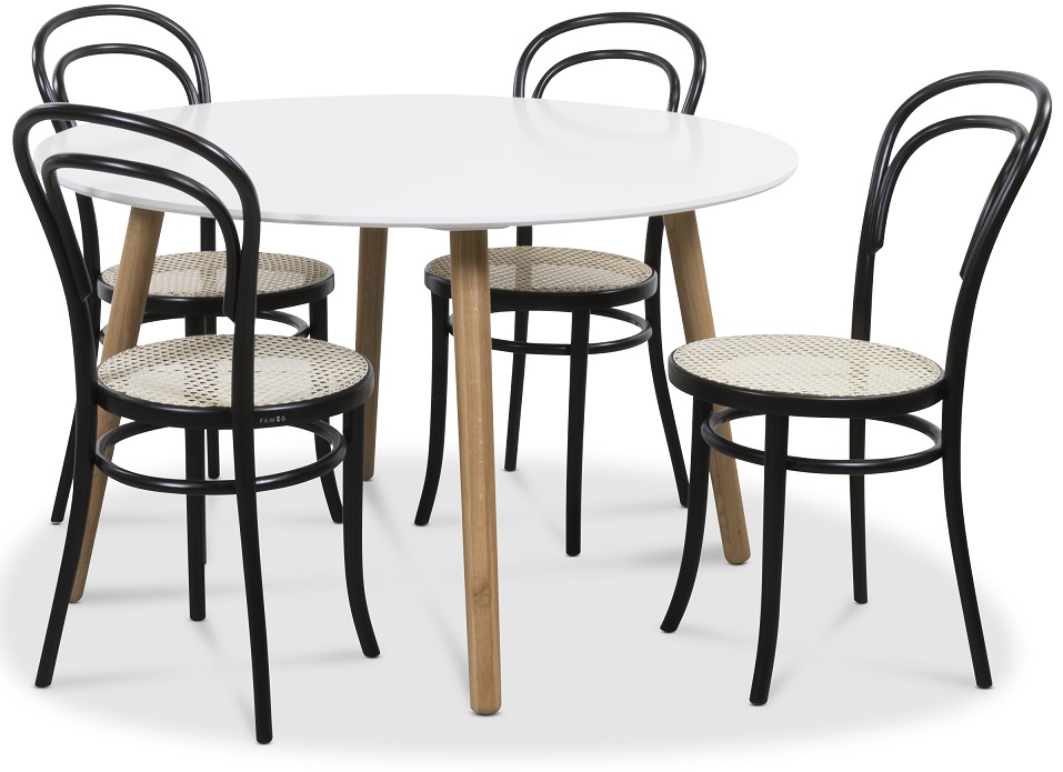 Spisegruppe fra Skånska Möbelhuset. Klassisk rundt spisebord Rosvik 120 cm diameter med hvitlakkert bordplate og eik bein samt fire stykk svarte Thonet no14 stoler med rotting seter som gir et klassisk og stilrent inntrykk!