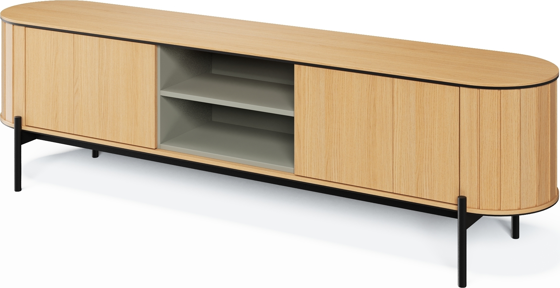 Laminert sponplate mediabenk med metallben. Det avrundede ytre i lysimitasjon støttes av en sort metallbase som letter rengjøringen. Innsiden er delt inn i 3 seksjoner med 2 oppbevaringsrom hver og er malt i eukalyptusgrønn. De ytre rommene er skjult av dører mens midtrommet er åpent. Leveres umontert.