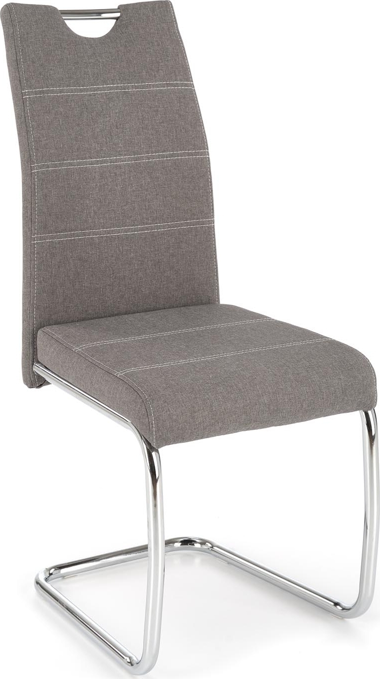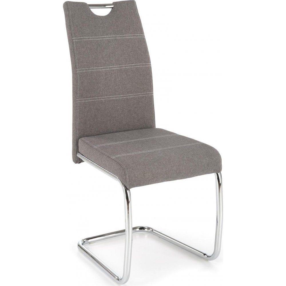 En fin spisestol med moderne design. Stolen er kledd med et veldig behagelig stoff for maksimal komfort og understellet er av forkrommet metall.