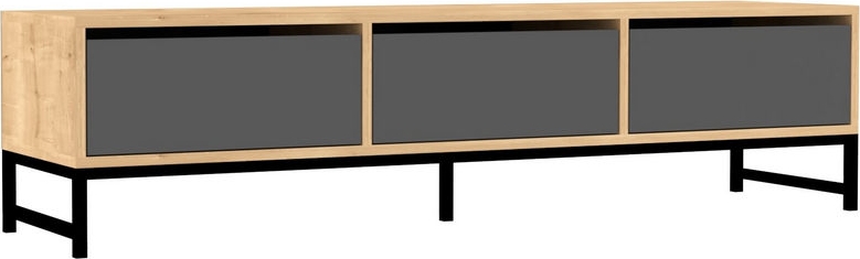 Mediebenk av melaminbelagt sponplate og metall.