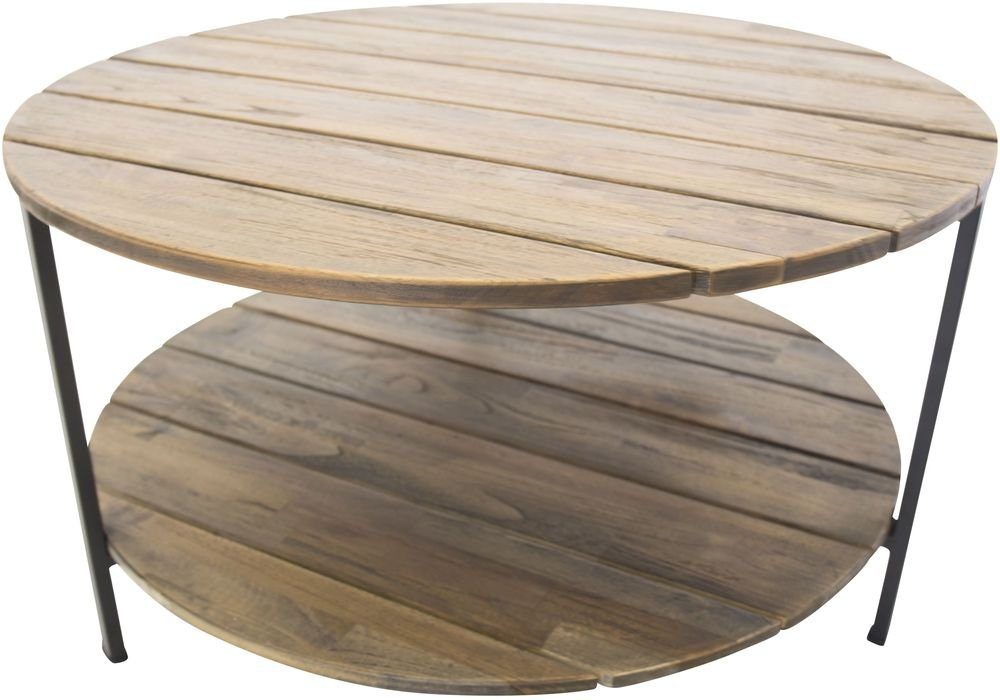 Salongbord av blandede treslag, mønster av vintagebrun teak. Stamme i svart metall.