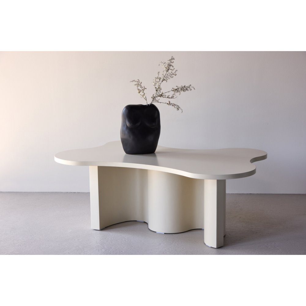Det unike bordbenet går langs hele bordet og gir designet en spennende silhuett med en tydelig karakter. Den varme beigefargen gjør Flow enkel å kombinere med forskjellige farger og materialer, noe som gjør den til et opplagt valg i både minimalistiske og mer personlige hjem.