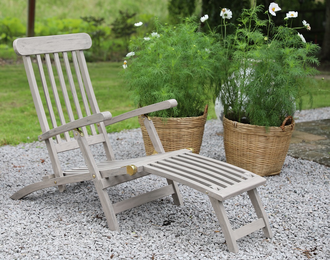 Saltö dekkstol i massiv grå teak fra Skånska Möbelhuset. En stol med fotstøtte for god komfort. Saltö er en klassisk serie møbler produsert i et oppgradert teaktre.