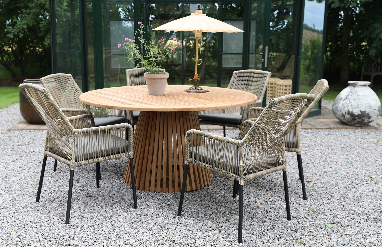 Saltö spisegruppe til uteplassen med et stort rundt spisebord i solid teak, sammmen med Ystad karmstoler i tvinnet beige kunstrotting, svartlakkerte ben og en grå komfortabel setepute. En moderne kombinasjon på uteplassen.