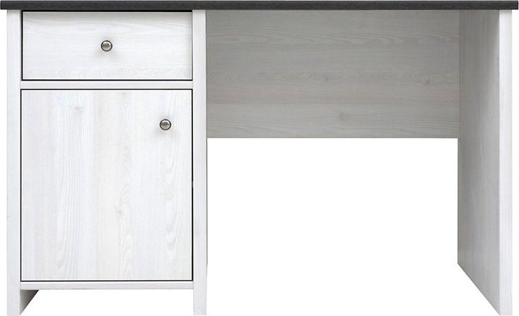 Praktisk skrivebord med gode oppbevaringsmuligheter i skap og skuff. Sølvfargede håndtak som en fin detalj.