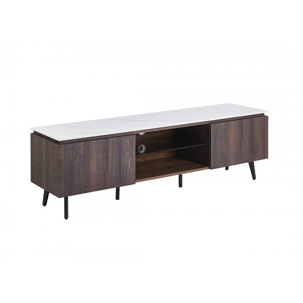Salvador mediabenk med topp i keramisk stein med hvit marmorfinish. Mørkebrunbeiset trefoliering. Bra med skjult oppbevaring bak de to frontdørene.
