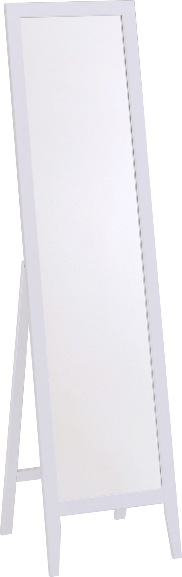 Et klassisk stående speil med en ramme i hvitmalt tre. Speilet passer perfekt inn på flere ulike plasser i hjemmet, for eksempel på soverommet.