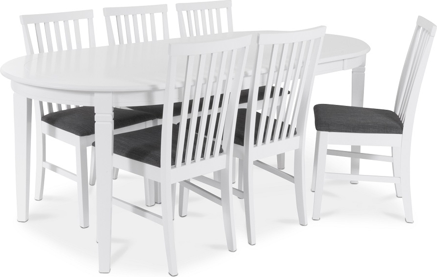Sandhamn er en klassisk matvaregruppe for praktiske behov! Ovalt bord med hele 200 cm lengde og 95 cm bredde for å romme mange gjester høykvalitets spisegruppe! Hvitlakkert heltre!