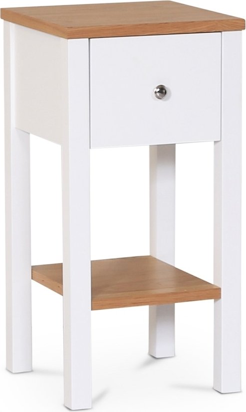 Sandhamn nattbord i klassisk design med praktisk oppbevaringshylle og skuff. Hvit lakkert ramme med finert eiketopp og hylle.