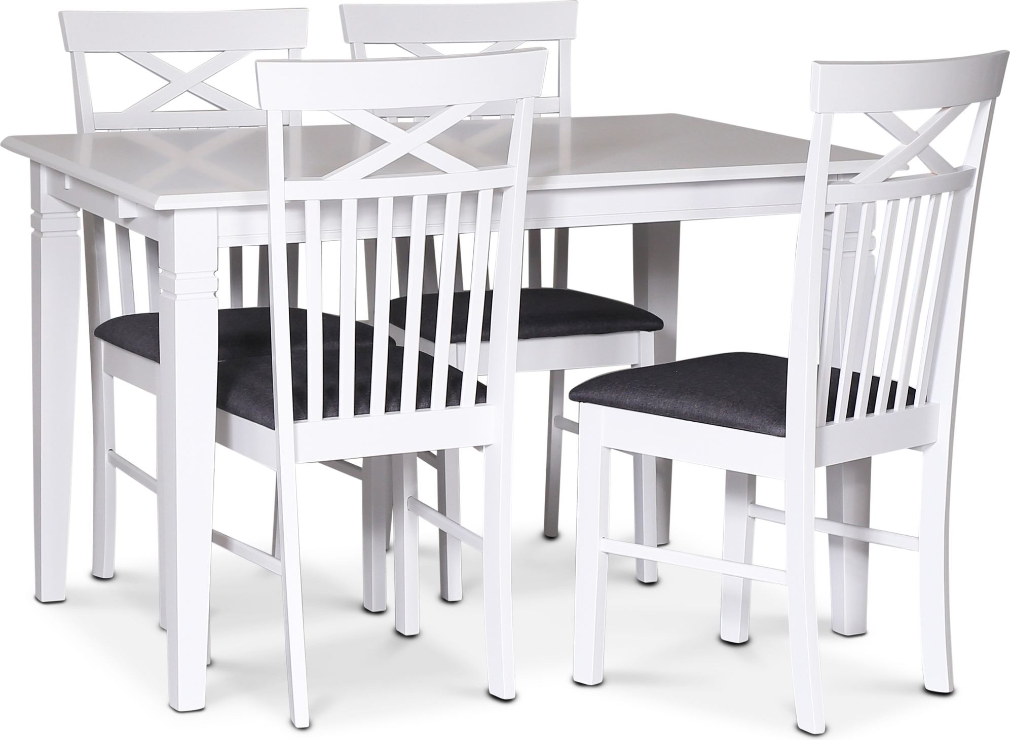 Det følger også med 4 Sofiero-stoler med kryss i ryggen og sete i grått stoff.