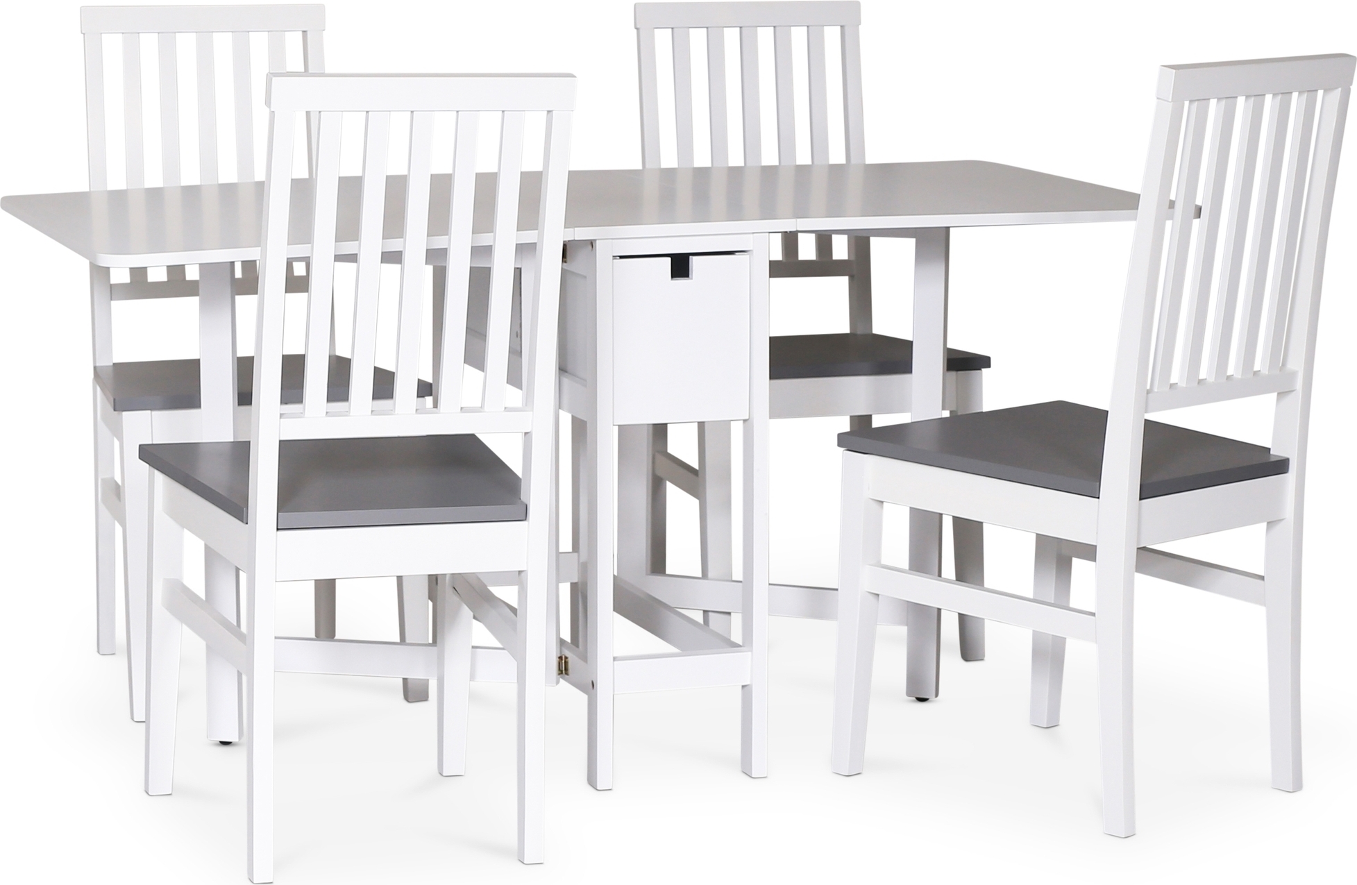 Sandhamn spisegruppe i klassisk design. Stilig klaffbord med 4 matchende Fårö-stoler i hvitlakkert tre med grått tresete.