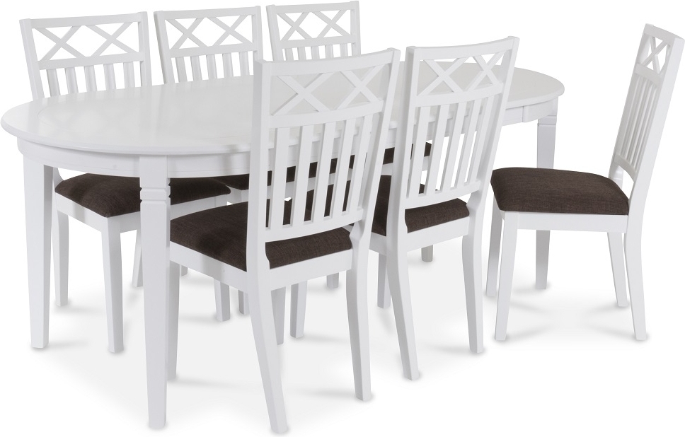 Sandhamn er en klassisk matvaregruppe for praktiske behov! Ovalt bord med hele 200 cm lengde og 95 cm bredde for å romme mange gjester høykvalitets spisegruppe! Hvitlakkert heltre!