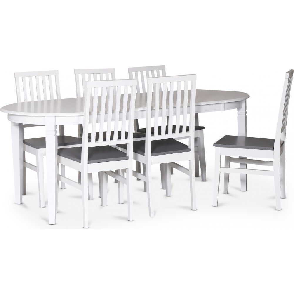 Sandhamn spisegruppe i klassisk design. Stilig ovalt spisebord med hvitlakkerte ben og bordplate.