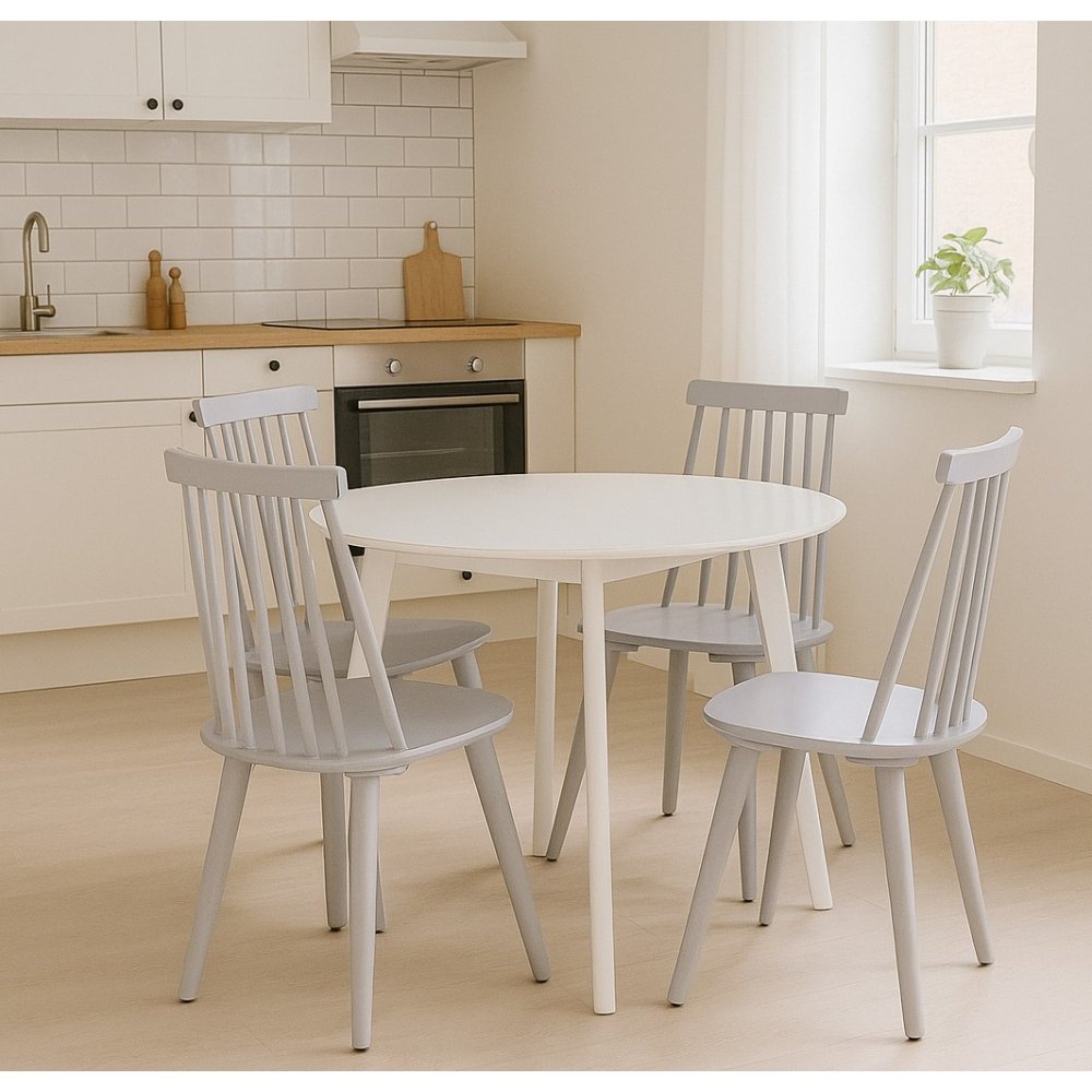Sandhamn spisegruppe; rundt spisebord med 4 grå Dalsland pinnestoler
