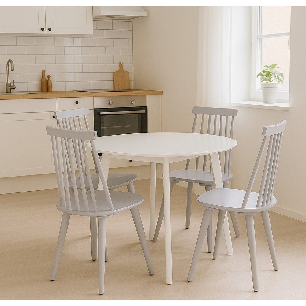 Sandhamn spisegruppe; rundt spisebord med 4 grå Dalsland pinnestoler: